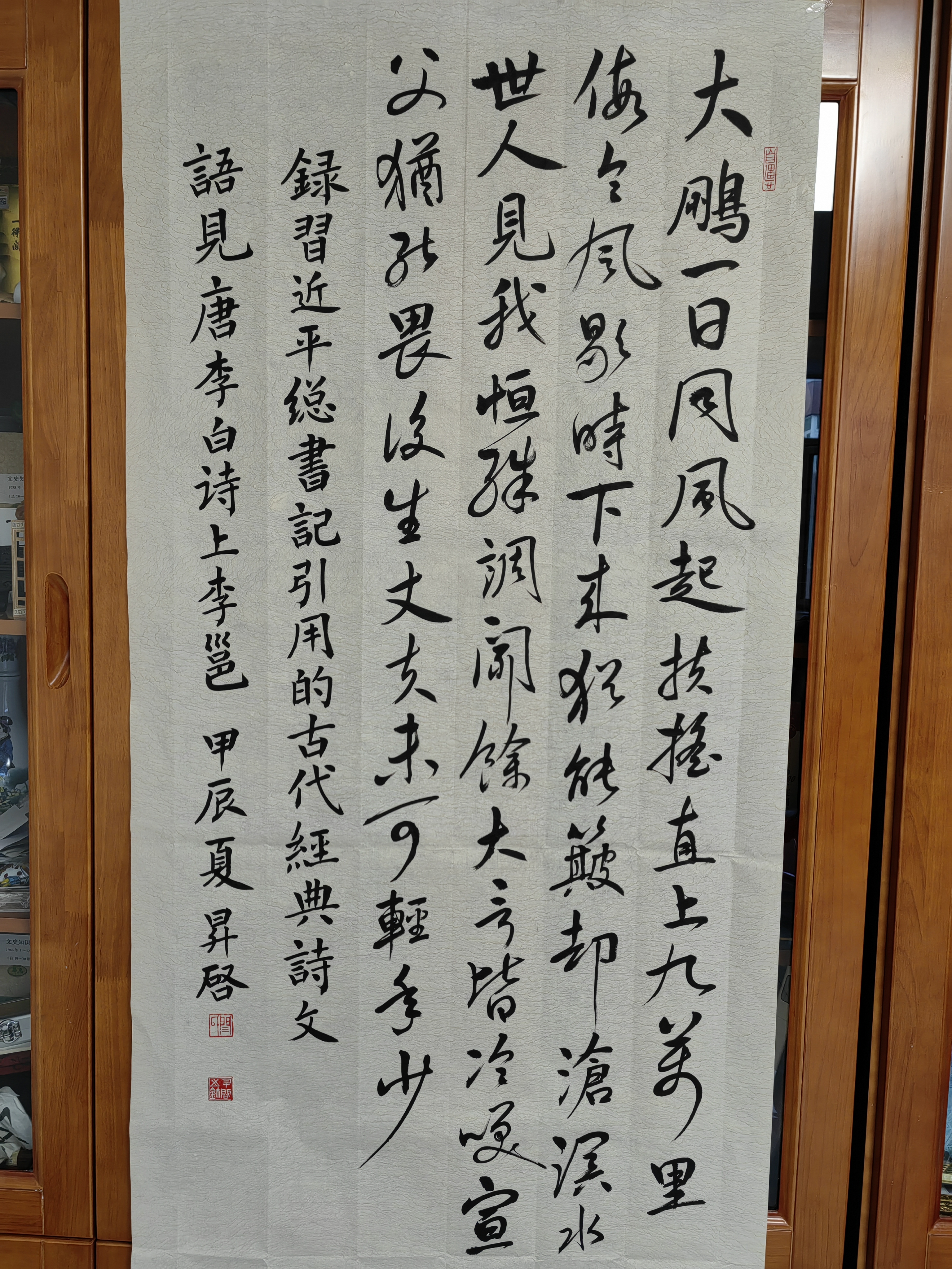 行書書法作品《上李邕》釋文:“大鵬一日同風起,扶搖直上九萬里。假令風歇時下來,猶能簸卻滄溟水。世人見我恒殊調,聞余大言皆冷笑。宣父猶能畏后生,丈夫未可輕年少。”,