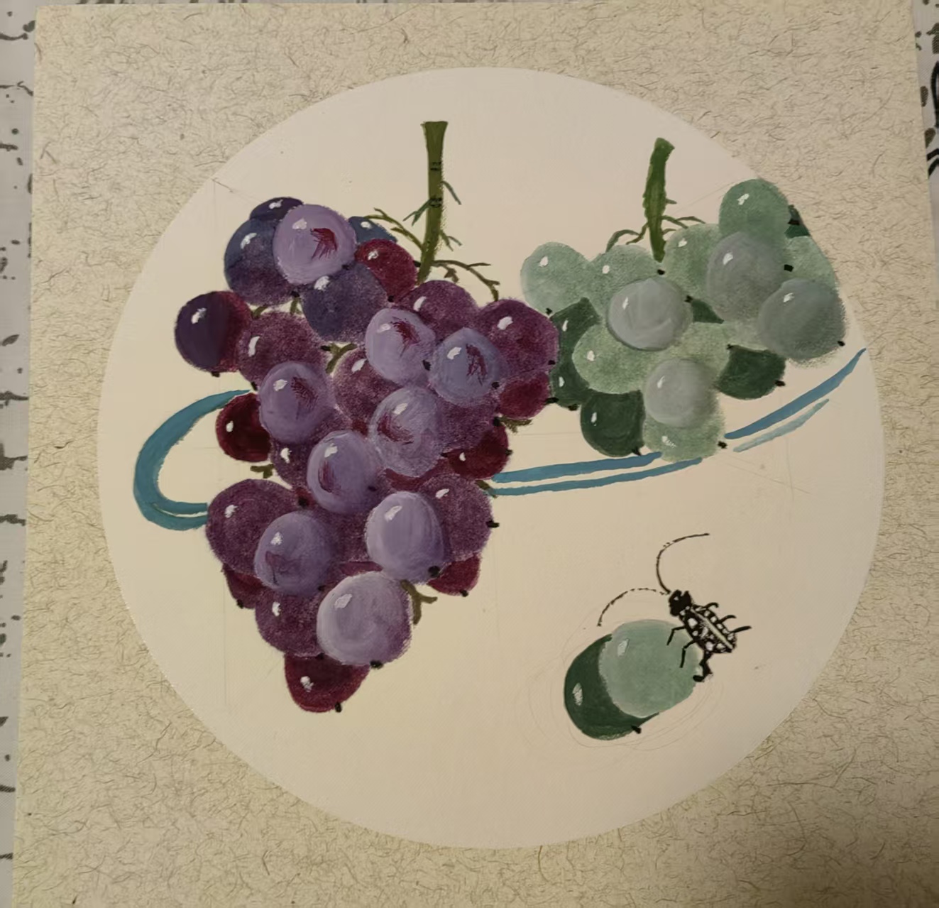畫作以葡萄為主題,葡萄串串飽滿,如累累碩果掛滿枝椏,既展現(xiàn)出自然的生機(jī)與豐饒之美,也象征中國(guó)二冶員工在工作中收獲的成果與希望,傳遞出積極向上、碩果累累的美好寓意。