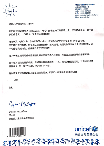 在信的最后,聯合國兒童基金會駐華代表再次代表急需幫助的中國困境兒童向該同志表達了衷心的謝意。