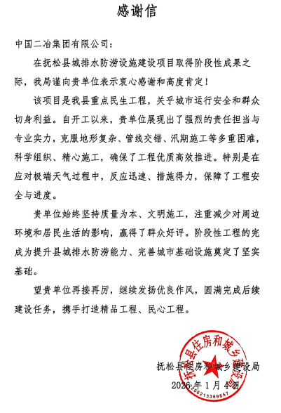 感謝信是對中國二冶建設(shè)成果的高度認(rèn)可,也是對團隊付出的充分信賴。未來,中國二冶將以此為激勵,持續(xù)深耕撫松縣建設(shè)領(lǐng)域,以更多優(yōu)質(zhì)精品工程賦能地方發(fā)展,為推動地區(qū)經(jīng)濟社會高質(zhì)量發(fā)展貢獻更大央企力量。