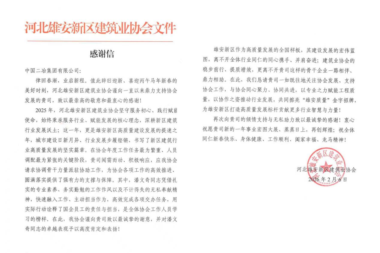 2月9日,中國二冶收到河北雄安新區建筑業協會發來的感謝信。信中對建筑分公司深耕雄安、賦能新區建設所付出的努力和取得的成效給予高度肯定,對全體建設者的堅守與擔當致以誠摯敬意,字里行間飽含著對中國二冶助力雄安高質量發展的認可與期許。