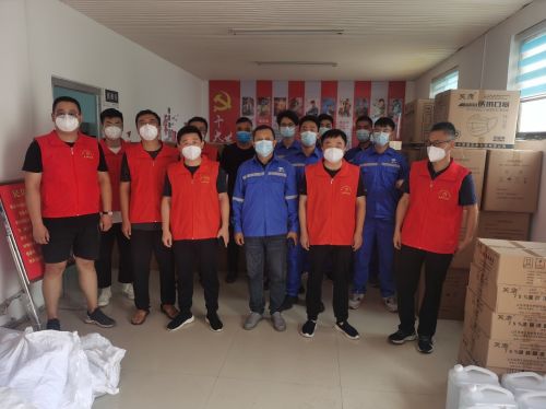 自曹縣本土疫情發生后,項目部迅速組織投入疫情防控工作,主動聯系邵莊鎮人民政府,了解到疫區的實際情況后,根據疫區所缺物資,立即進行防疫物資采購并送往疫區。一輛輛滿載防疫物資的車輛紛至沓來,一位位管理人員揮汗如雨,搬運、卸貨,很快防疫物資堆成了小山,其中捐贈口罩20000只、消毒液100公斤、方便面100箱、礦泉水4箱。