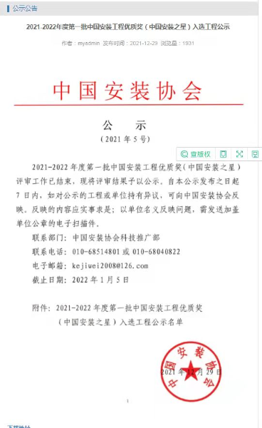 中國安裝之星于1998年經(jīng)建設(shè)部批準(zhǔn)設(shè)立,是由中國安裝協(xié)會組織實(shí)施的安裝行業(yè)的獎(jiǎng)項(xiàng)。該獎(jiǎng)項(xiàng)的評選內(nèi)容主要側(cè)重于安裝技術(shù)和施工絕活。該獎(jiǎng)項(xiàng)設(shè)立以來,對安裝企業(yè)的科技創(chuàng)新、技術(shù)提高和技術(shù)推廣起到了很好的推動(dòng)作用。